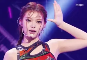 에스파 카리나 밀착 은박 의상 덜렁이는 가슴