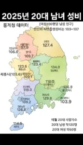2025년 한국 각지역 20대남녀 성비