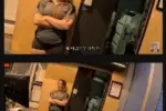 명이 휴대전화틀 보고 물병올 내려놓으여