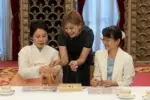 다: 여성들 뒤로는 ‘예술단’ 이라고 적히 빨간색 행사용 현수