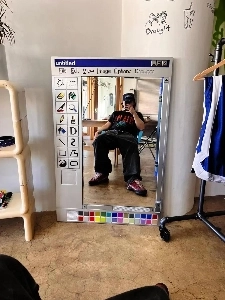 거울보고 확인중인 그릴래영 회색 오프솔더