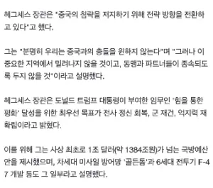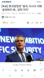 [속보] 미 국방장관 “”””중국, 아시아 지배 통제하려해침략 저지””””