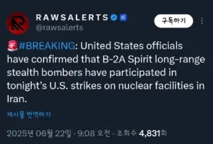 [속보] 미국, B-2 스텔스 폭격기 이란 핵시설 공습 참여 확인