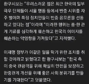 중국 관영매체 “한국 내 반중 시위, 韓中관계 심각하게 훼손”
