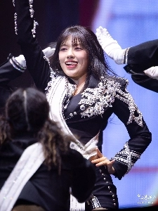 무대 위의 대형견 아이브 안유진.검정 제복 건강한 엉벅지