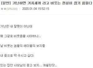 가난하면 거지새끼라고 비웃는 현실이 참기 힘들다.