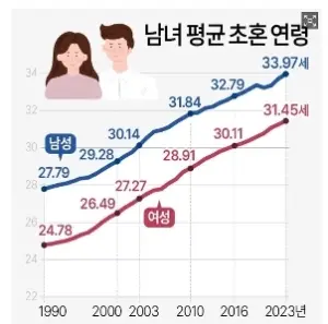지난 30여년간 남녀 결혼 연령 추이