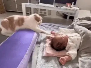아기손을 만지는 고양이