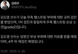 김도영 햄스트링 그레이드2 진단.twt