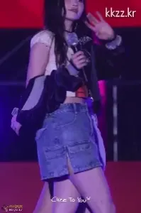 뒤에서 찍은 ITZY 류진 청치마 검정 속바지 매끈한 엉벅지