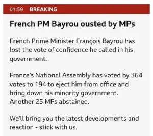 BBC속보) 프랑스 내각 붕괴