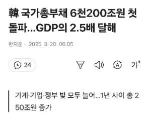 韓 국가총부채 6천200조원 첫 돌파…GDP의 2.5배 달해