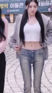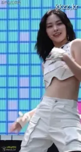 빨간 포니테일 ITZY 유나.핑크색 민소매 청핫팬츠 엉밑살 레전드